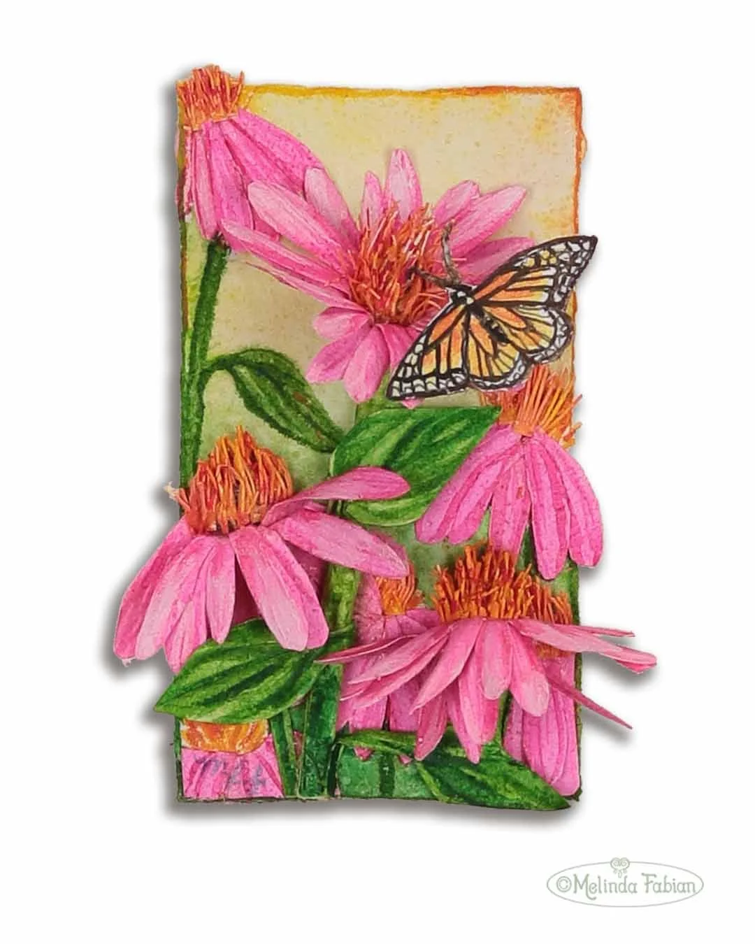 A paper sculpture featuring cone flowers and a monarch butterfly