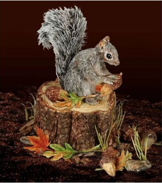 Like my other paper sculptures, I want viewers of this squirrel to find a moment of escape that evokes an emotional response, whether that’s joy, delight, surprise, nostalgia or tranquility. Can you smell the cool autumn air and hear the squirrel chirping to his nearby friends from his tree trunk soapbox? Perhaps he is reminding them to collect all the acorns they can before the cold winter sets in. You might see your own version of the story as you look at the squirrel in his natural habitat.