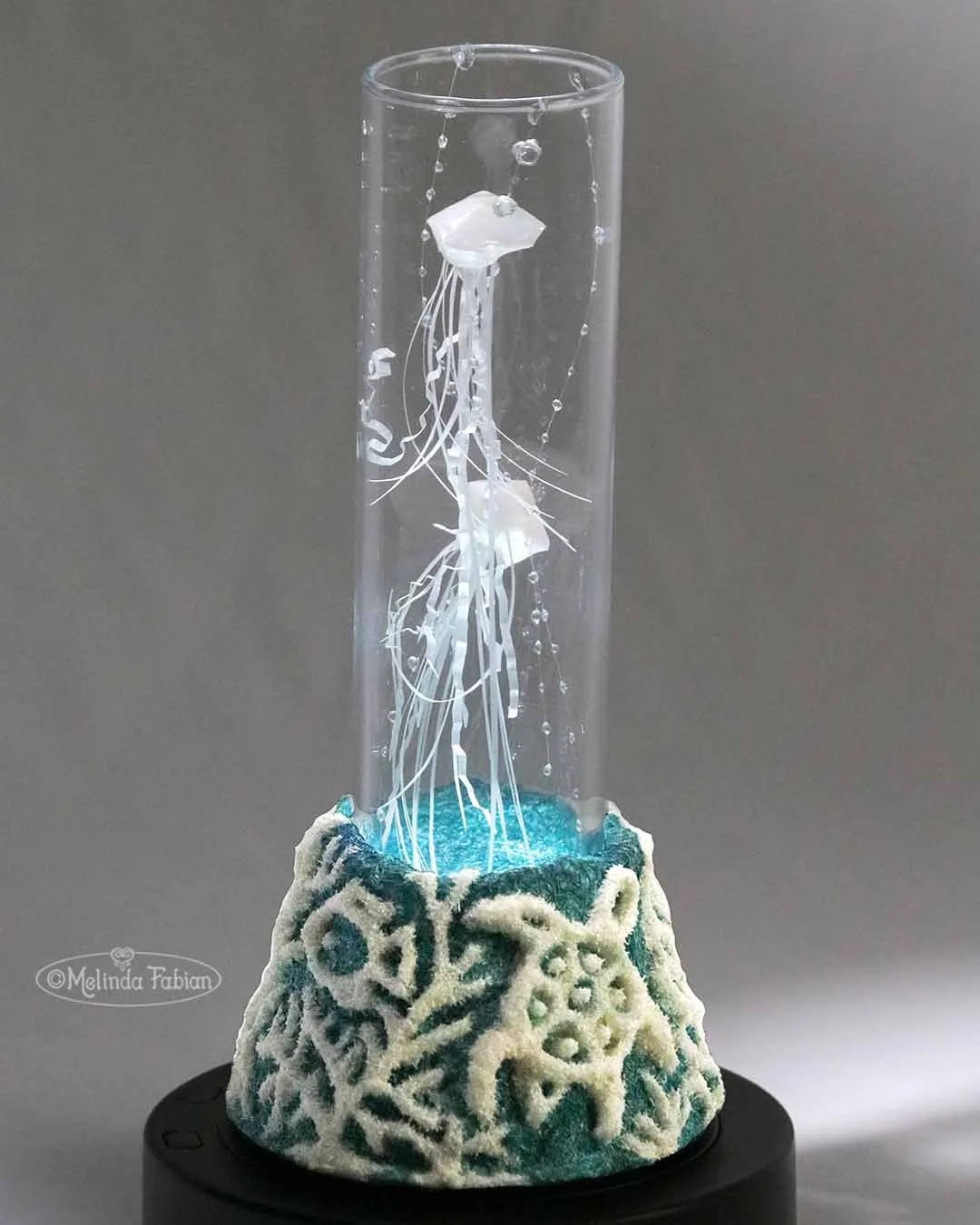 This paper sculpture features two floating jellyfish in a lighted glass tube. The sand-like base is made entirely from paper