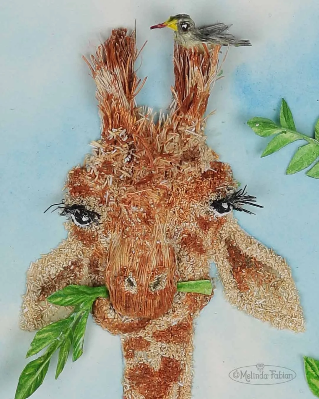 Paper Sculpture of an adorable giraffe munching on some tasty leaves. The title of this piece, “Hey! What’s Up?” is a little play on words, because it appears a little bird is riding along with the giraffe making a home in her furry ossicone. Did you also notice the giraffe’s long eyelashes and her great big heart? The giraffe is made out of paper and watercolor and gouache.