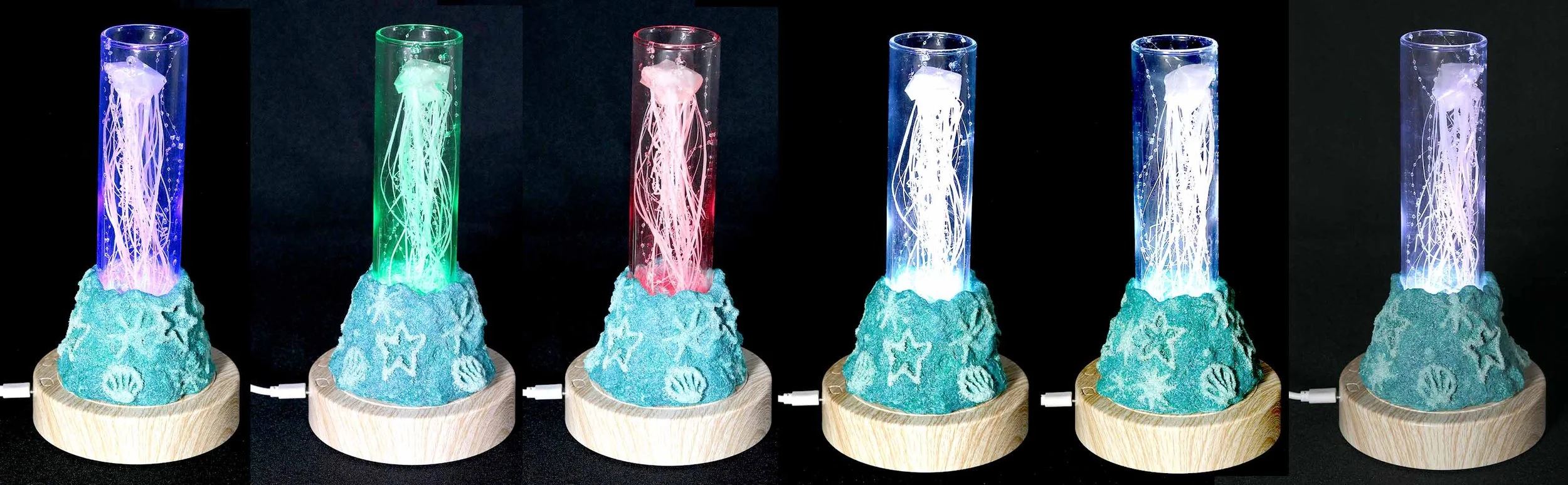 “Jellyfish Aquarium” can set on a rotating lighted base that changes colors as it rotates. The light can also be set to remain on one color as it rotates and lights up the jellyfish creating the effect that the jellyfish are actually floating inside the glass cylinder.
