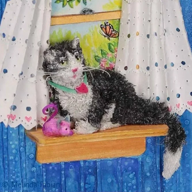 A paper sculpture of a young black and white tuxedo cat sitting on a window sill with her favorite pink toy mouse. Outside the window, is a male and female cardinal and a monarch butterfly outside the window.