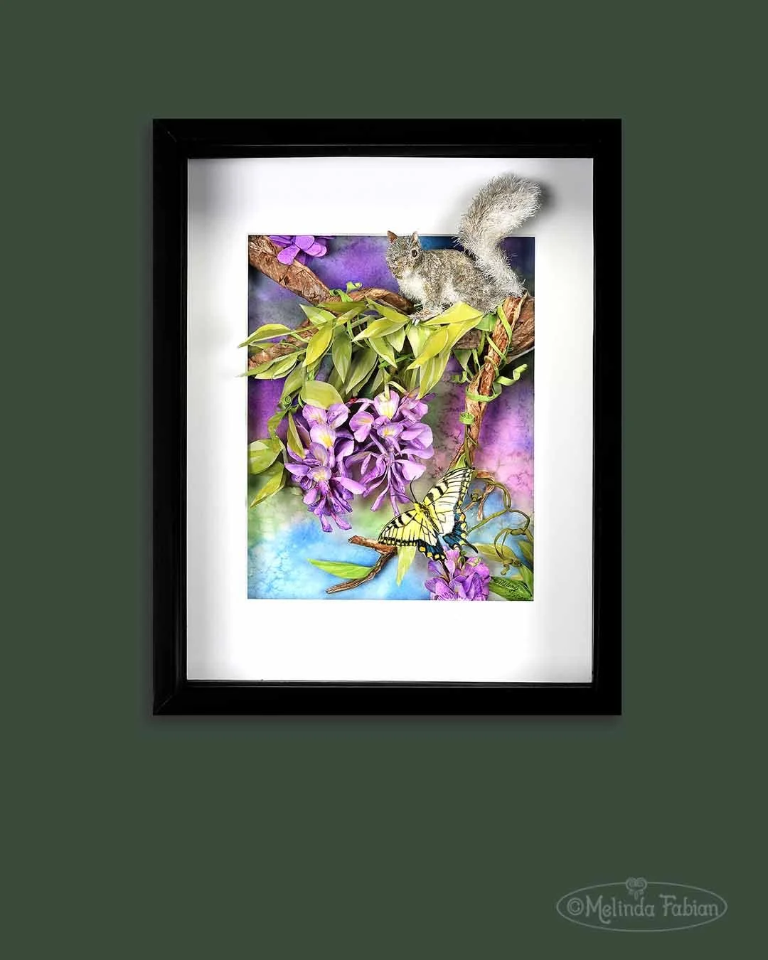 Beautiful hand painted, three-dimensional paper wisteria flowers with a detailed, three-dimensional paper sculpted squirrel sits on a branch and a swallowtail butterfly and little ladybugs stops by to visit. This piece is created from hand sculpted paper.