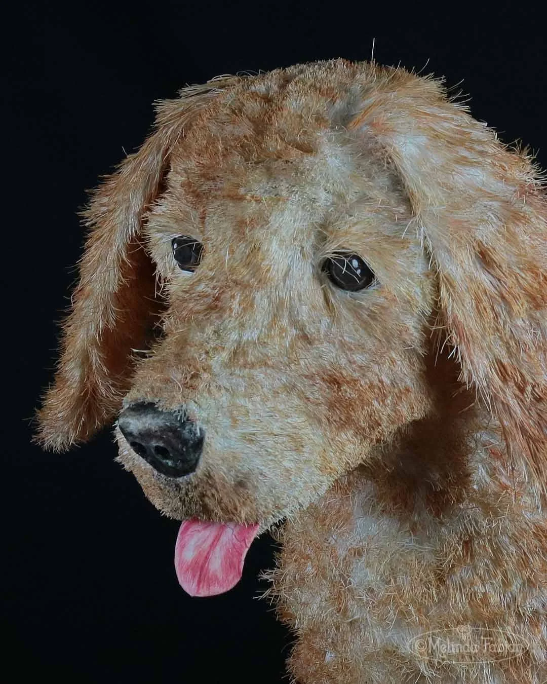 This life-size paper sculpture dog has very thinly cut paper fur.