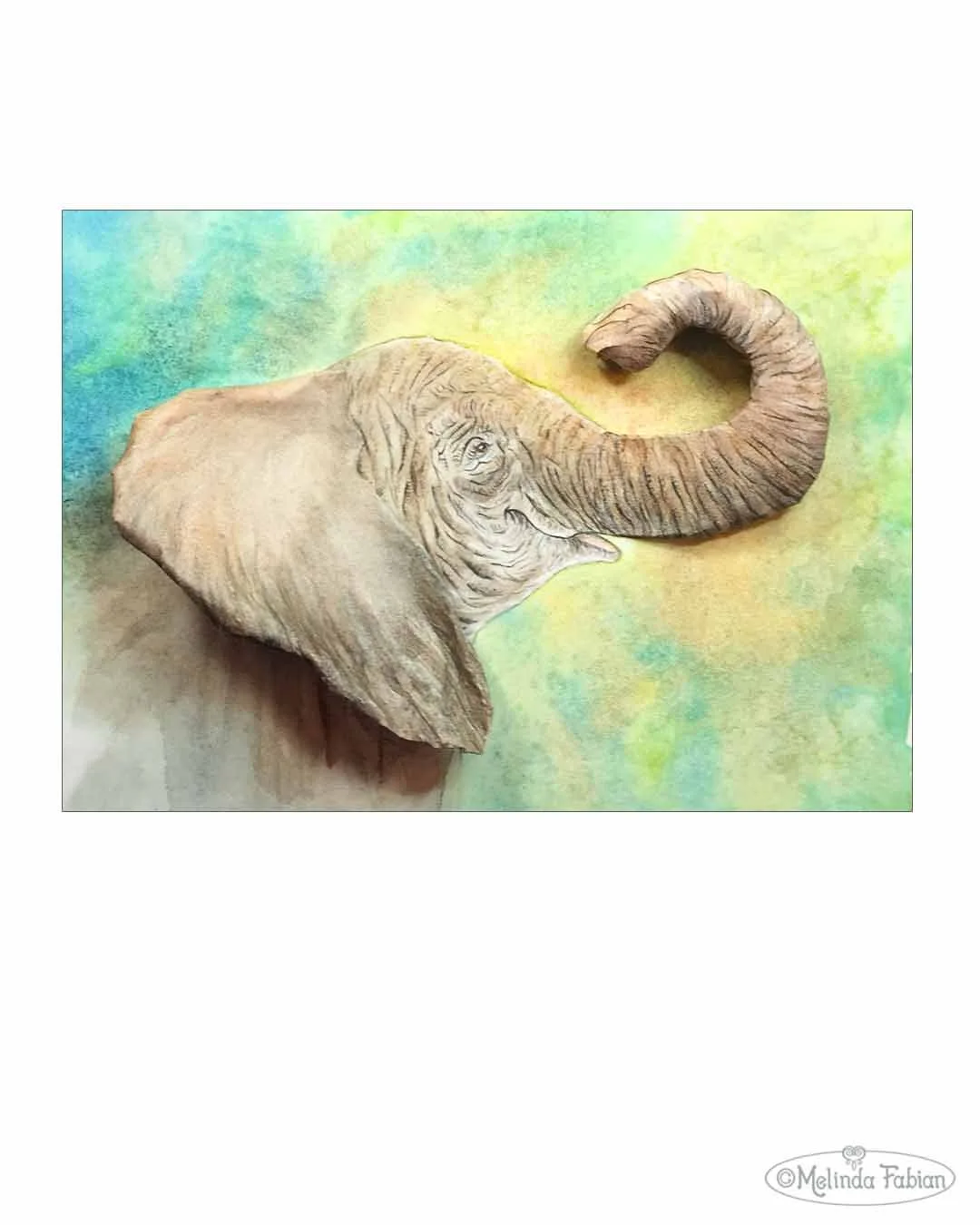 This paper sculpture features an adorable elephant with his trunk raised waiting for someone to feed him some peanuts.