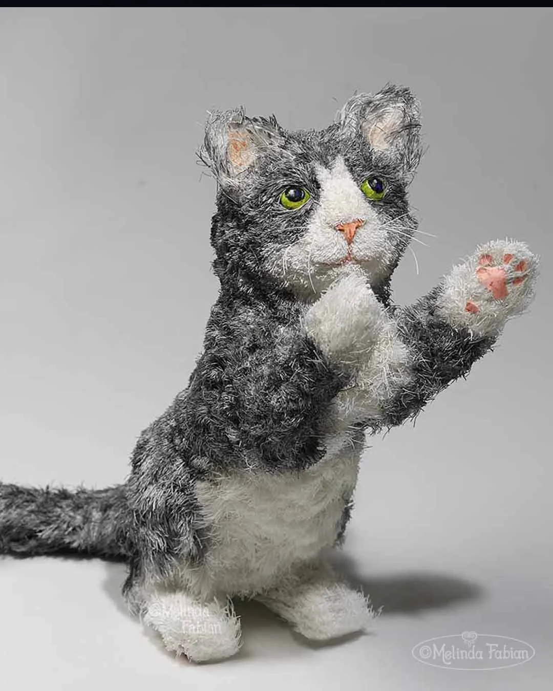 A paper sculpture of a cute little tuxedo kitten ready to play
