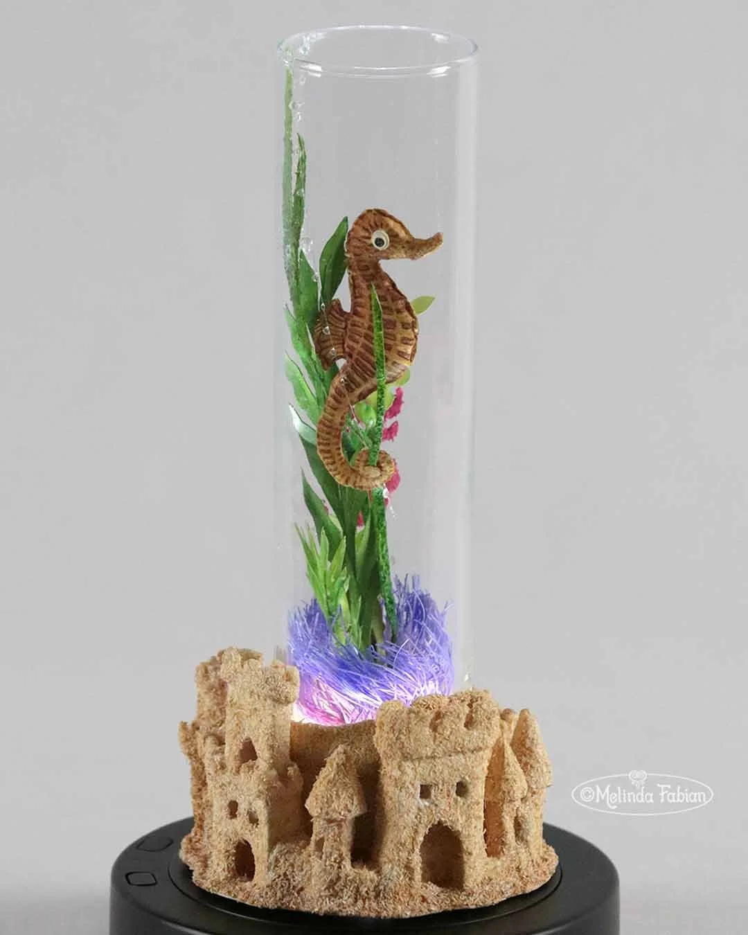A paper sculpture featuring a seahorse with its tail wrapped around a sea plant. The base features a sand castle motif made completely from paper.