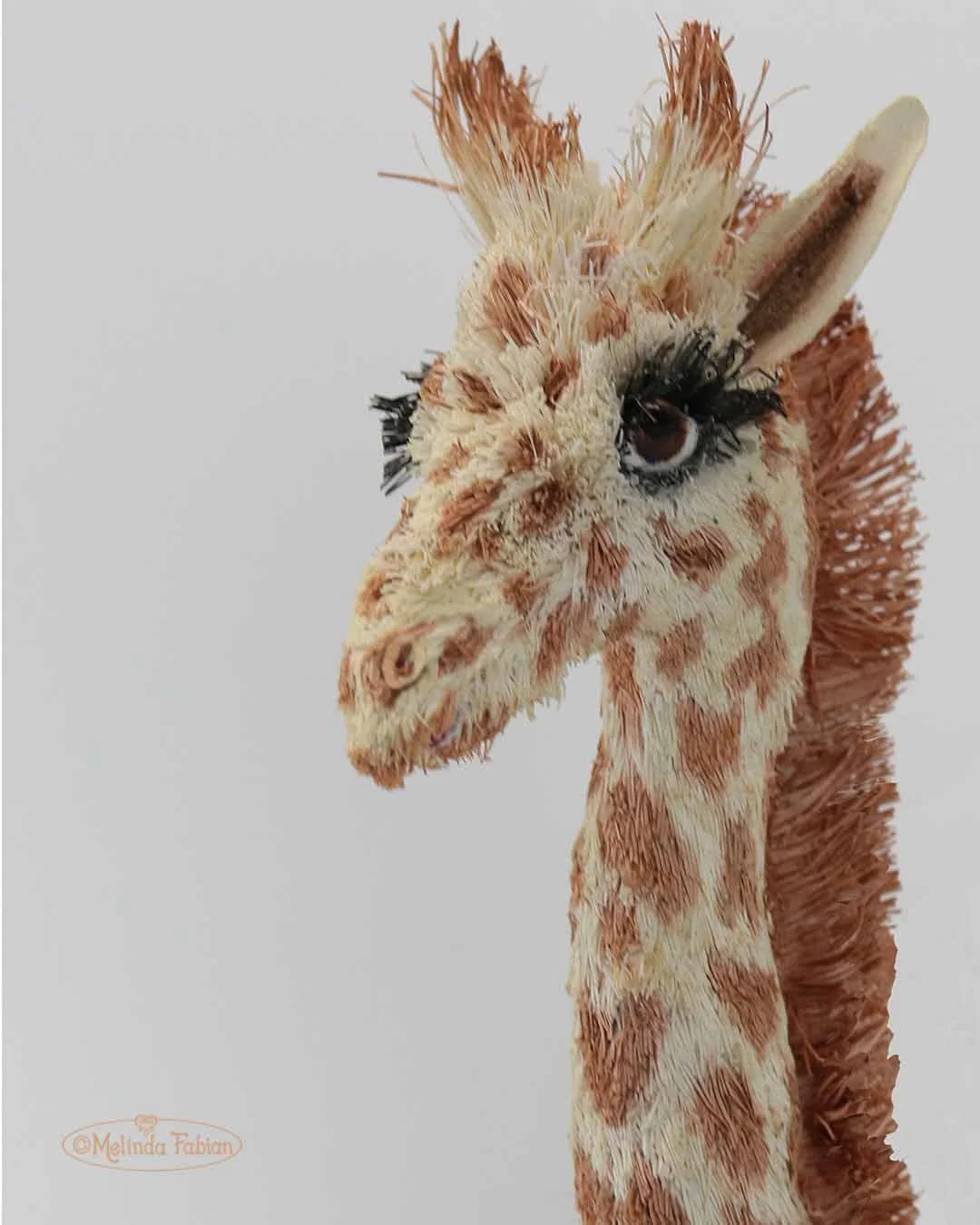 The 3D whimsical paper sculpted art - the giraffe is handmade out of paper and paint. Melinda meticulously hand cut white paper into very thin strips of paper, and attached it to the giraffe's sculpted paper body. Did you also notice her long lashes and big dark colored eyes? It took two weeks to complete this giraffe out of paper and paint.
